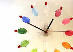 確か?今日のお昼に食べたコンビニ弁当の中にあった、お魚の醤油差が時計にくっついています。それぞれ着色された醤油差は、醤油を差す?かわりに時を告げるという、自分たちの本来の仕事ではない仕事に、文句ひとつ言わず取り組んでいます(笑)。